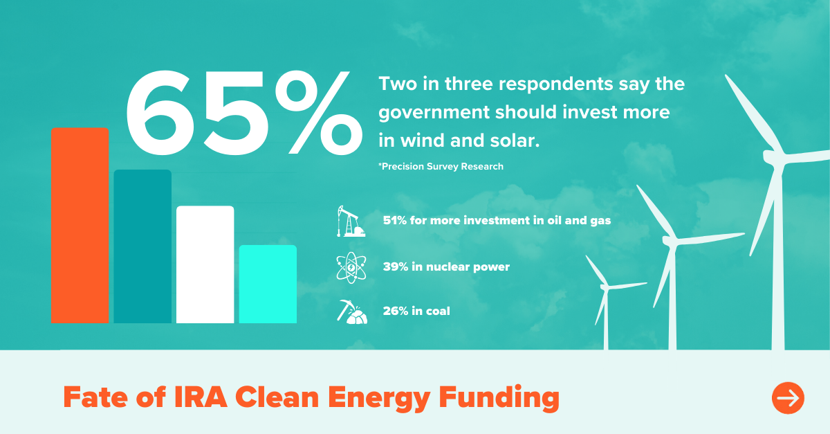 (When asked to choose, 61% of respondents say the government should provide clean energy tax cuts that support electric vehicles, wind, solar, and other renewable energy projects instead of focusing on general tax cuts across the board.)