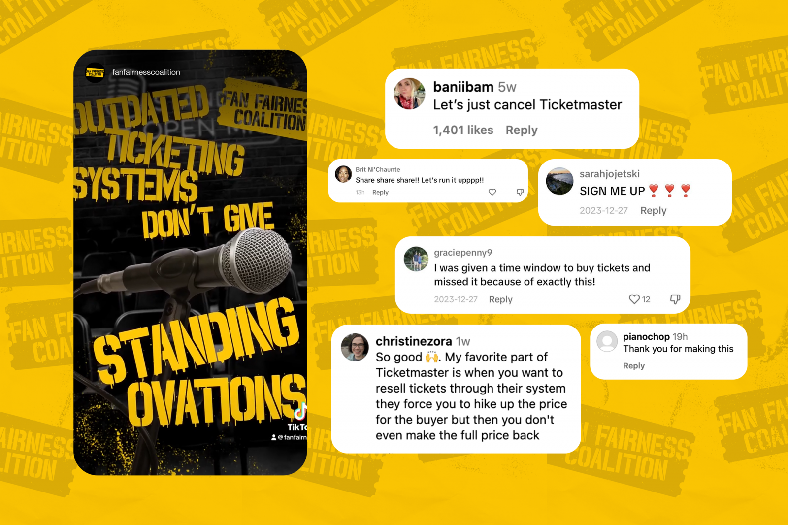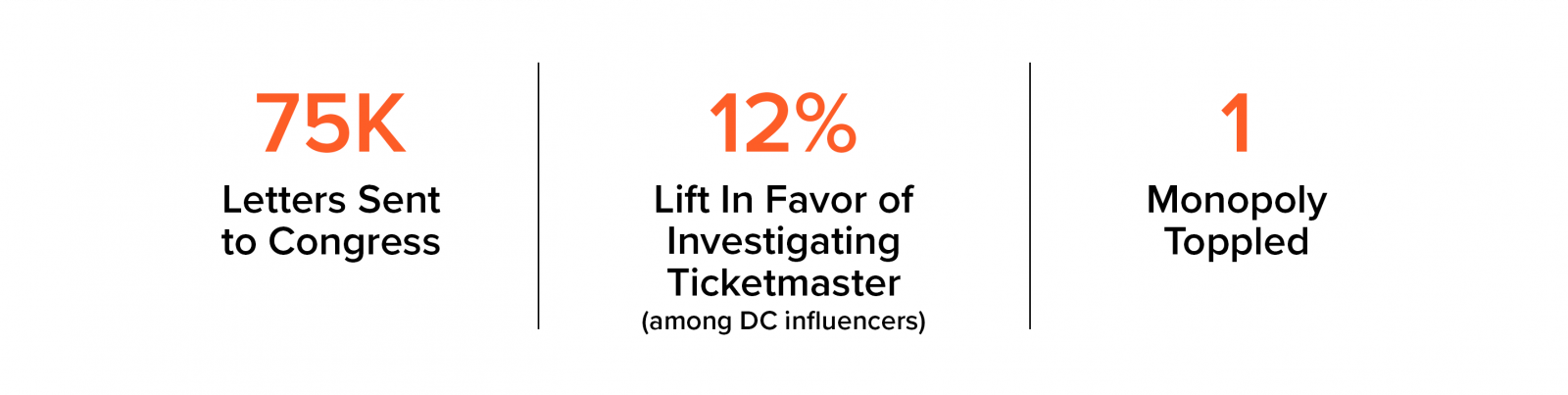 We created a suite of paid and organic social media assets to target and rally music fans across the country. We found superfans by targeting adults who were searching or interacting with content about concerts/tours or news about Taylor Swift, BTS, Harry Styles, and Bad Bunny. Through a paid and organic social media campaign, including an influencer campaign, we reached millions of fans who took action by either posting about the campaign themselves or sending a letter directly to Congress. This campaign was awarded Best Public Affairs campaign by PRWeek in 2025.