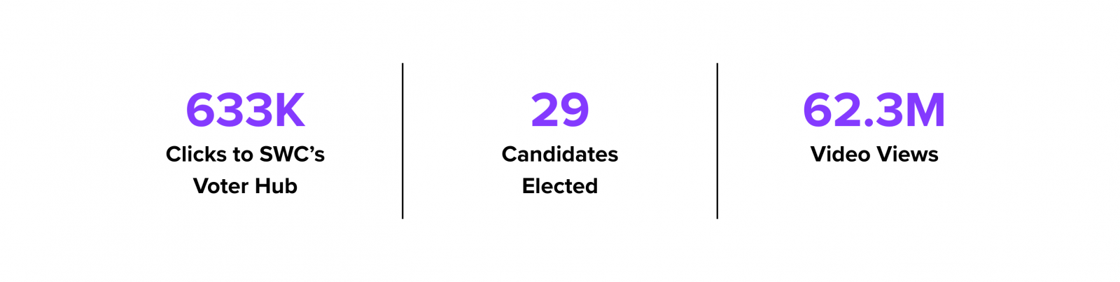 Our unique programmatic approach, informed by media consumption research, resulted in 633K unique clicks to SWC’s voter hub, reaching 8.9 million Crypto users, and electing 29 pro-crypto candidates in target races.